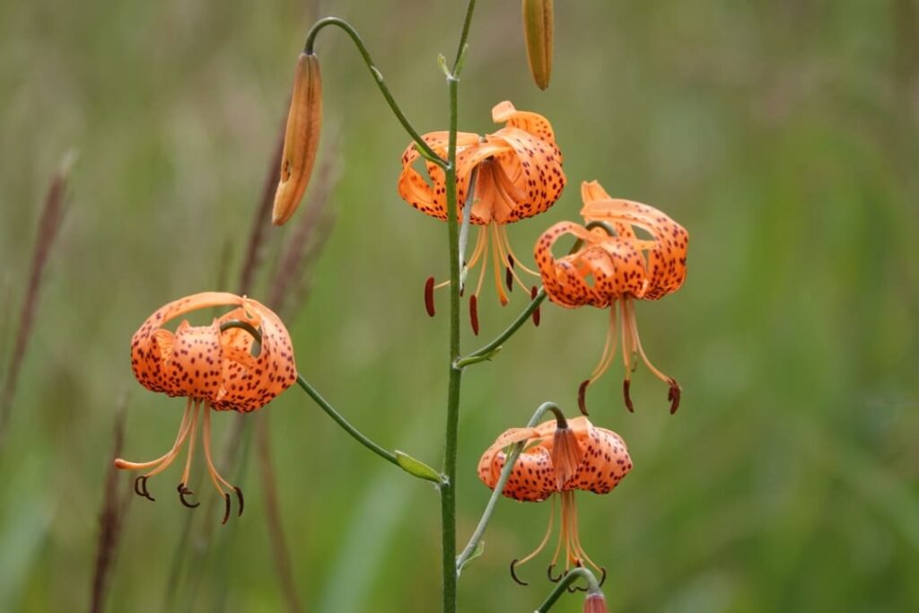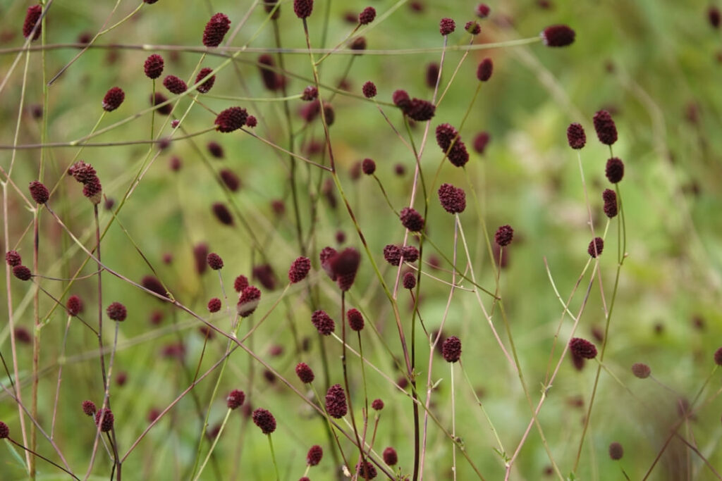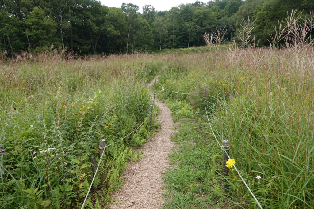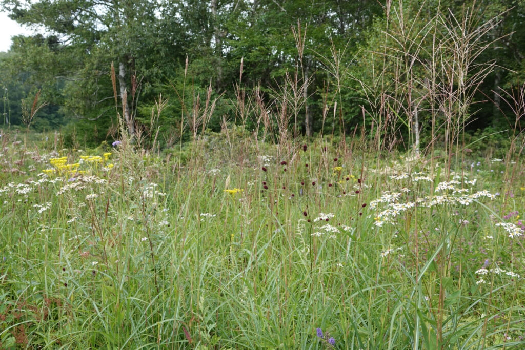 現地に到着すると、草原は初秋といった面持ちで、前回咲き始めだったノハラアザミやヒヨドリバナの花は終わりに近づき、かわりにマツムシソウやワレモコウが満開で、群生するススキも多数穂が出ていました。