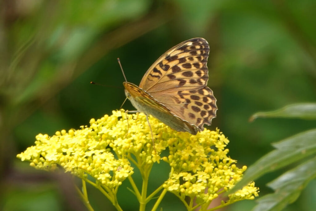 アサギマダラは僅かになったヒヨドリバナの花の間をゆらゆらと行き来していました。ヒョウモンチョウ類も数が少なくなり、ジャノメチョウやアゲハチョウが多く舞っていました。その他のチョウ類は、キタキチョウ、モンシロチョウ、セセリチョウ、シジミチョウ、キベリタテハなど。