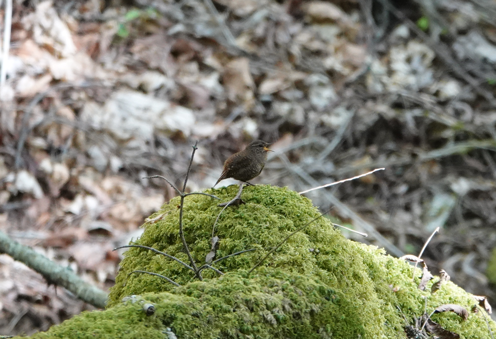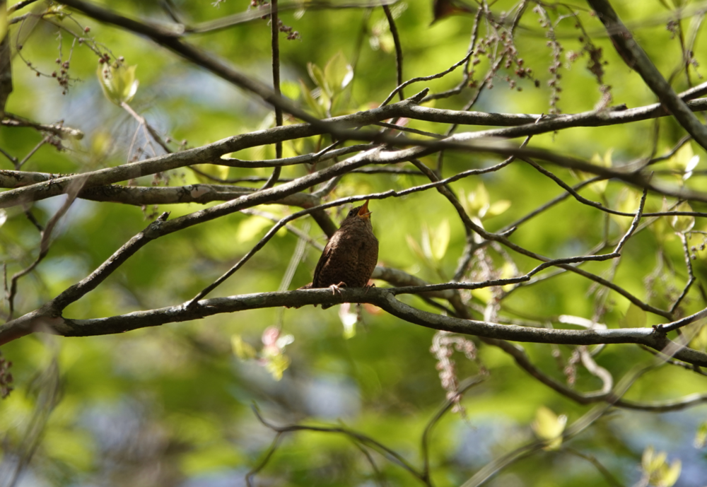 キビタキとともに大きなさえずりをみせていたのが、ミソサザイです。姿はカワガラスを小さくしたような焦げ茶色の鳥ですが、小さな姿からは想像もできないほど大きな声を全身から発していました。