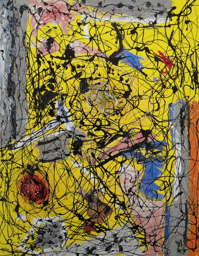 彼の絵画は、‘ドリッピング’ や ‘ポーリング’ と呼ばれる手法で、床に置いたキャンバス上に、塗料を滴らせたり 流し込んで描きます。一見、無造作に思える技法ですが、いずれの作品も意図的に 全体の構成を緻密に計算しながら描いていると作者は語っています。