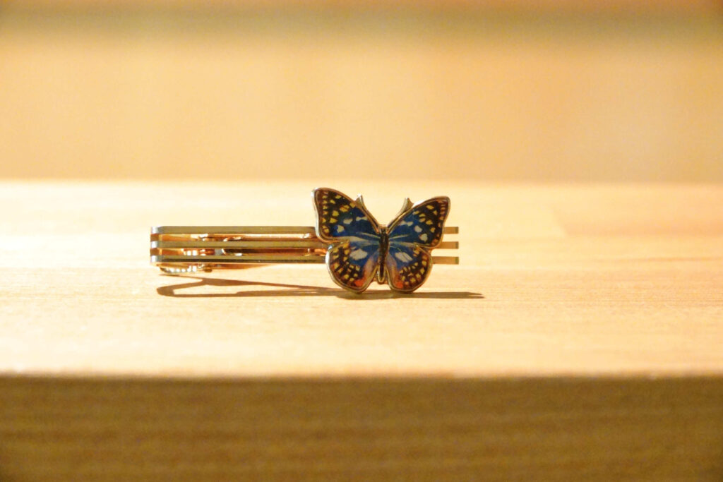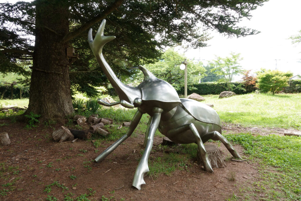 最後に おまけですが、当センターの庭にある大きなカブトムシのオブジェです。以前、フィオーレ小淵沢に置かれていたオブジェでしょうか。 もう一つ。かつてJR日野春駅(オオムラサキセンター最寄り駅)でのみ販売していた レア物品 ‘オオムラサキのタイピン’ です(現在は販売していません)。