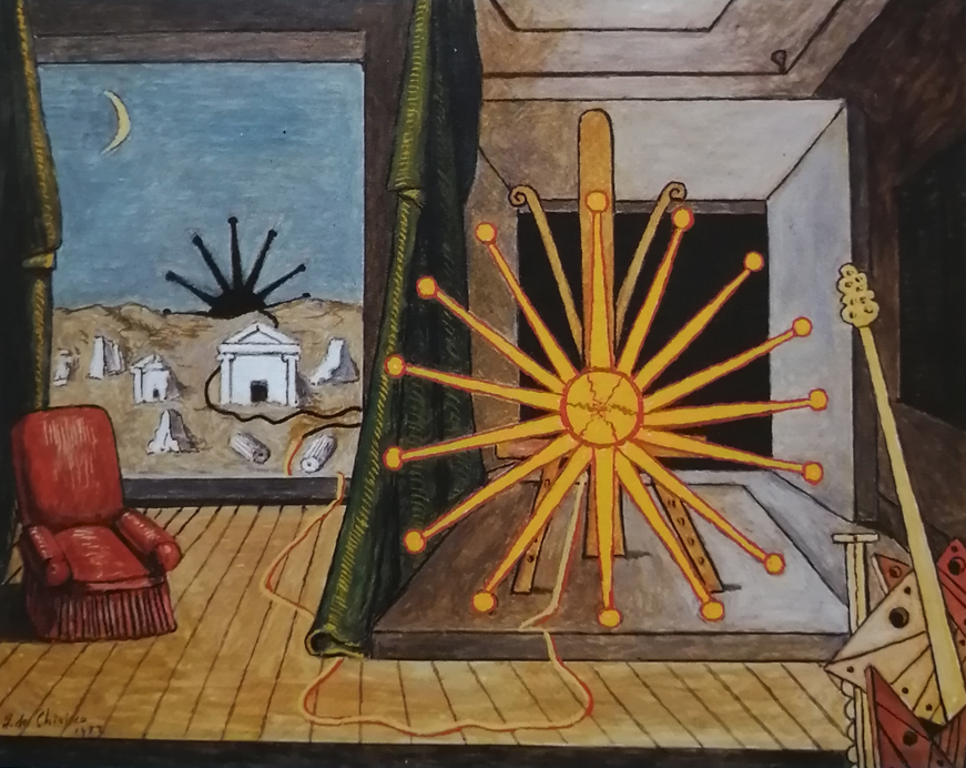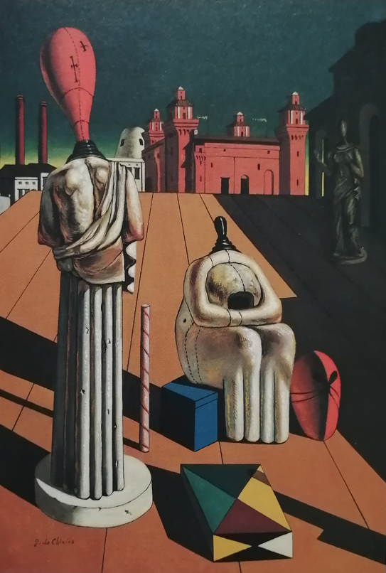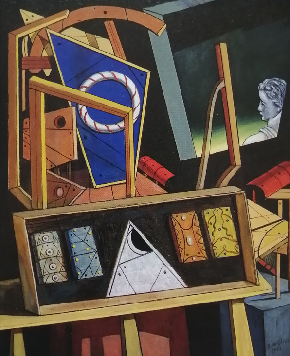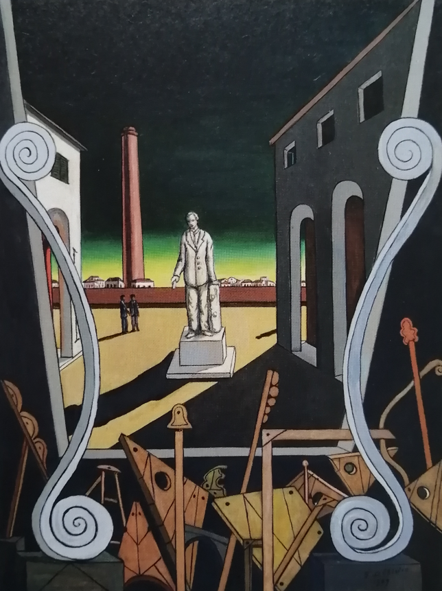 彼の作品は ‘形而上絵画’ と呼ばれています。何やら難しそうな呼び名ですが、「幻想的な風景や静物によって非日常的な世界を表現する絵画」という意味だそうです。実際の作品は、初期から晩年にかけてやはり形容することが難しく、しかし 鑑賞者を不思議世界へ導き魅了します。