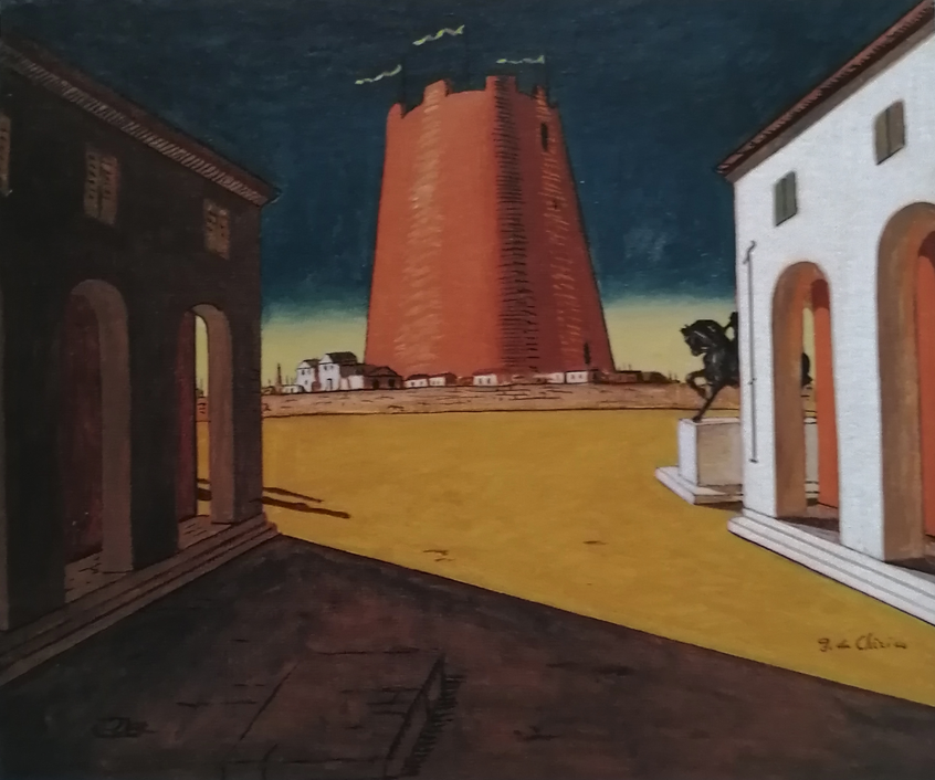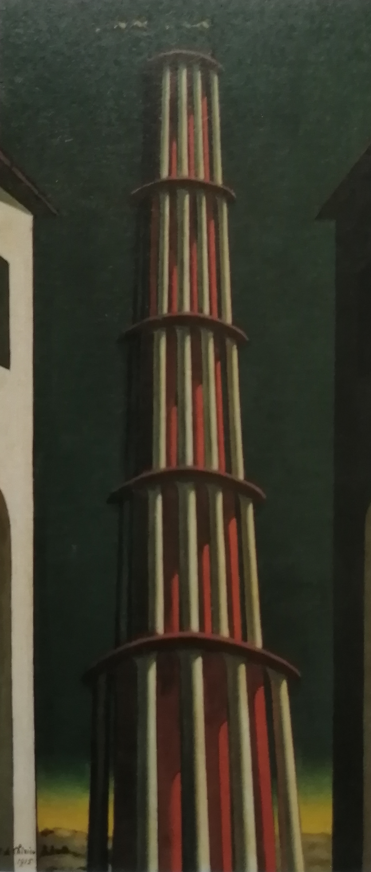 私がキリコ作品で好きなのは、‘大きな塔(1915)’やバラ色の塔のあるイタリア広場(1934頃)’など、深い陰影を用いて描かれた塔や広場で、人の気配をあえて排除したかのような無機的な感じの作品です。