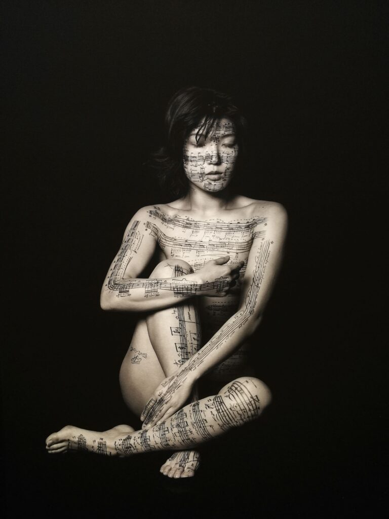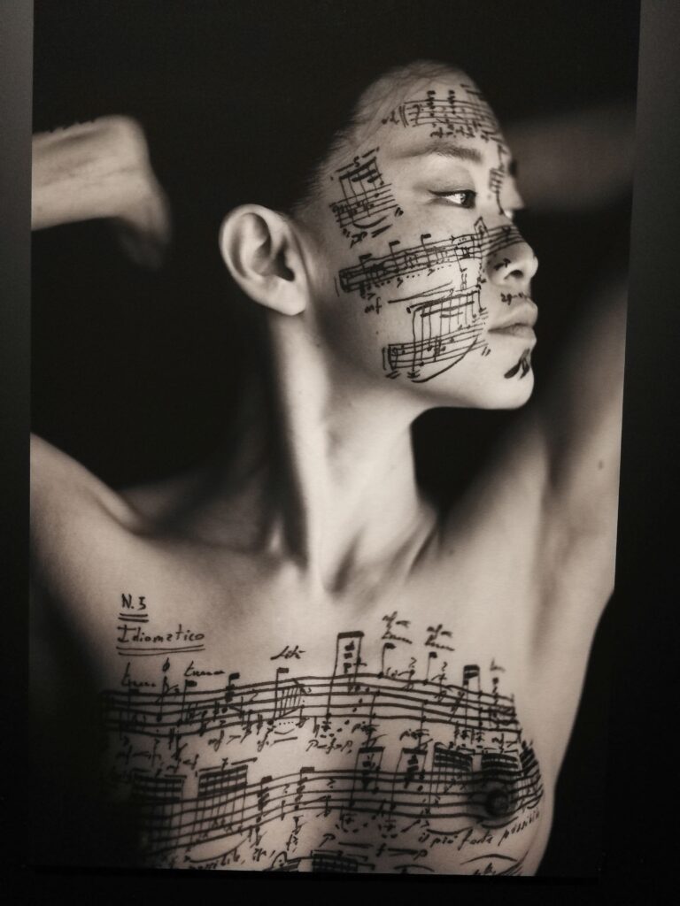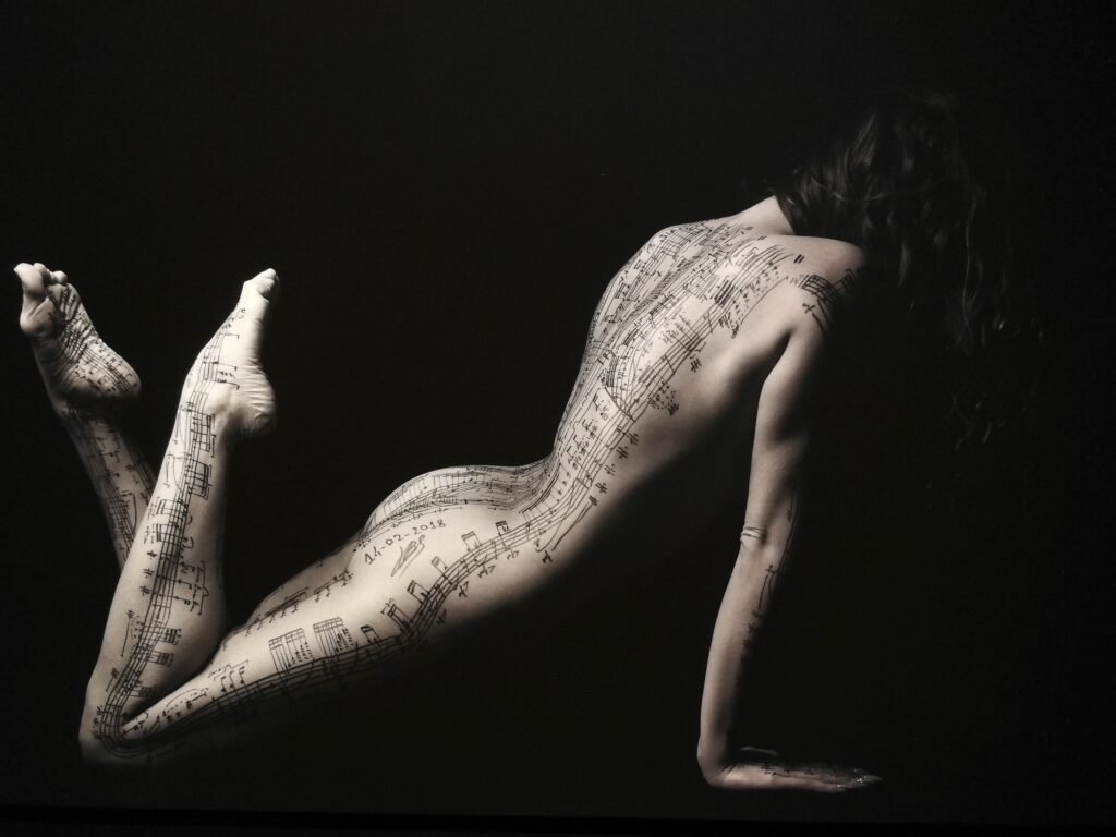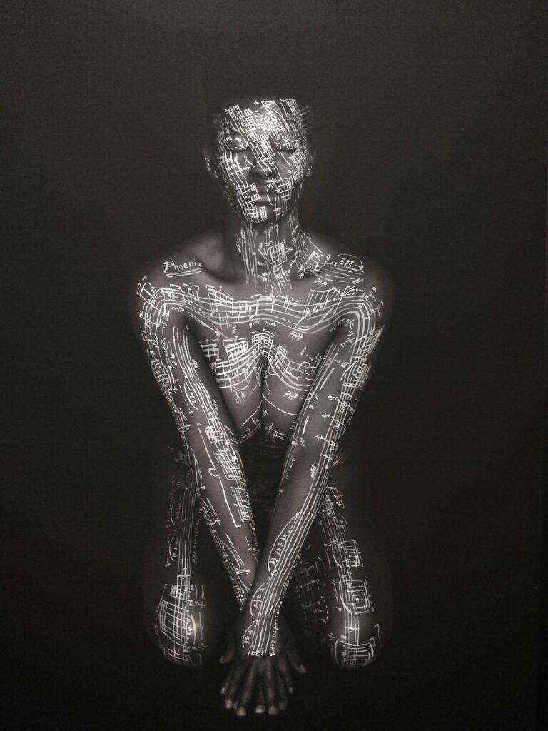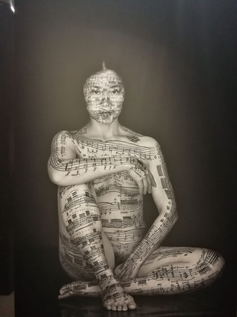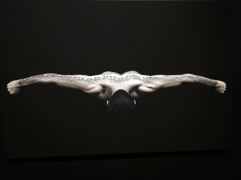 様々にポージングした人体に直接楽譜を描き、撮影した写真作品の数々。これらの中には、鑑賞者が前に立つと そこに描かれている楽譜の曲が流れる作品もあり、その(現代音楽のような)音色は静かでやや照明が落とされた空間に調和し、会場そのものが一つの作品といえるような雰囲気をつくり出していました。
