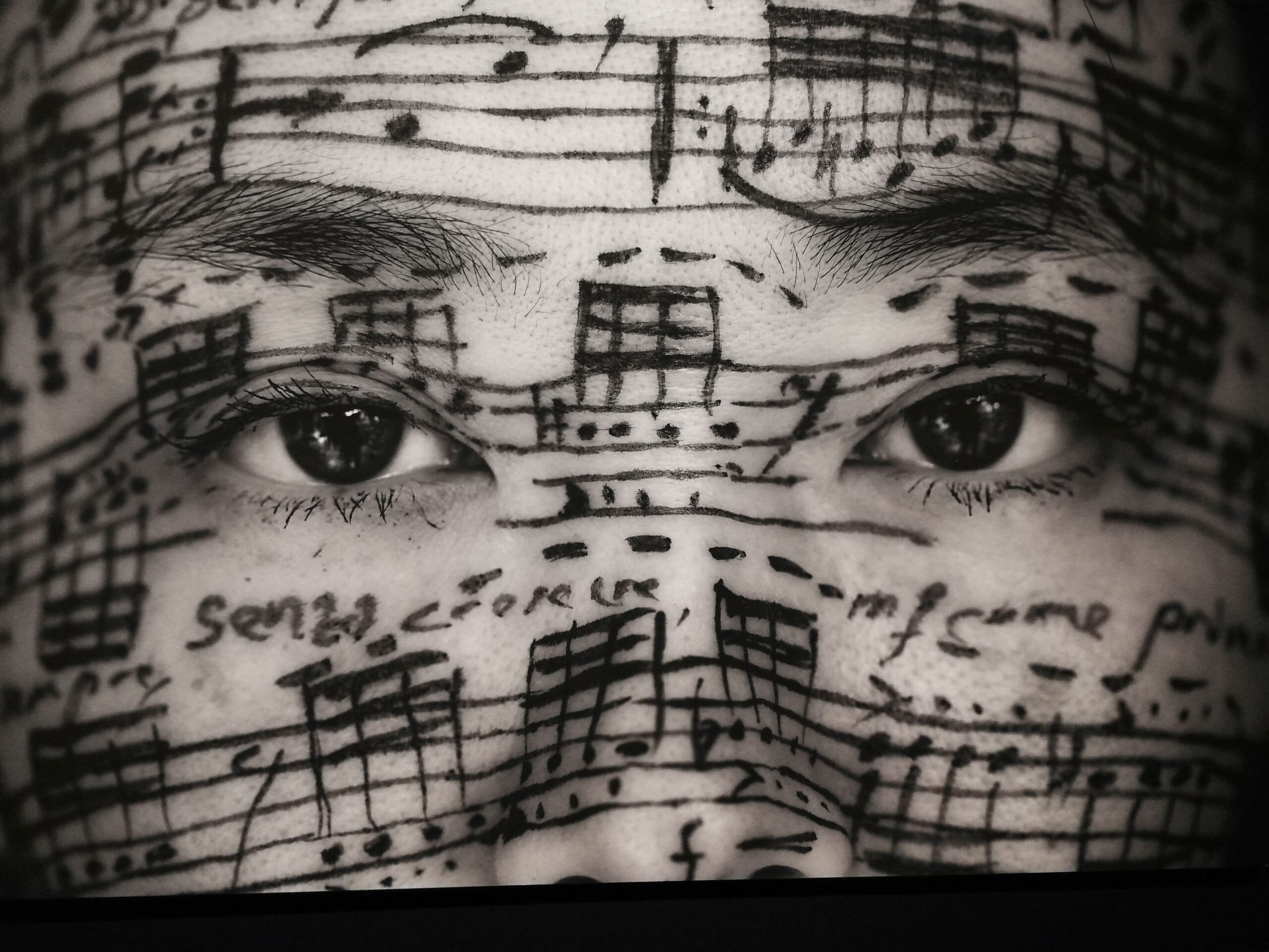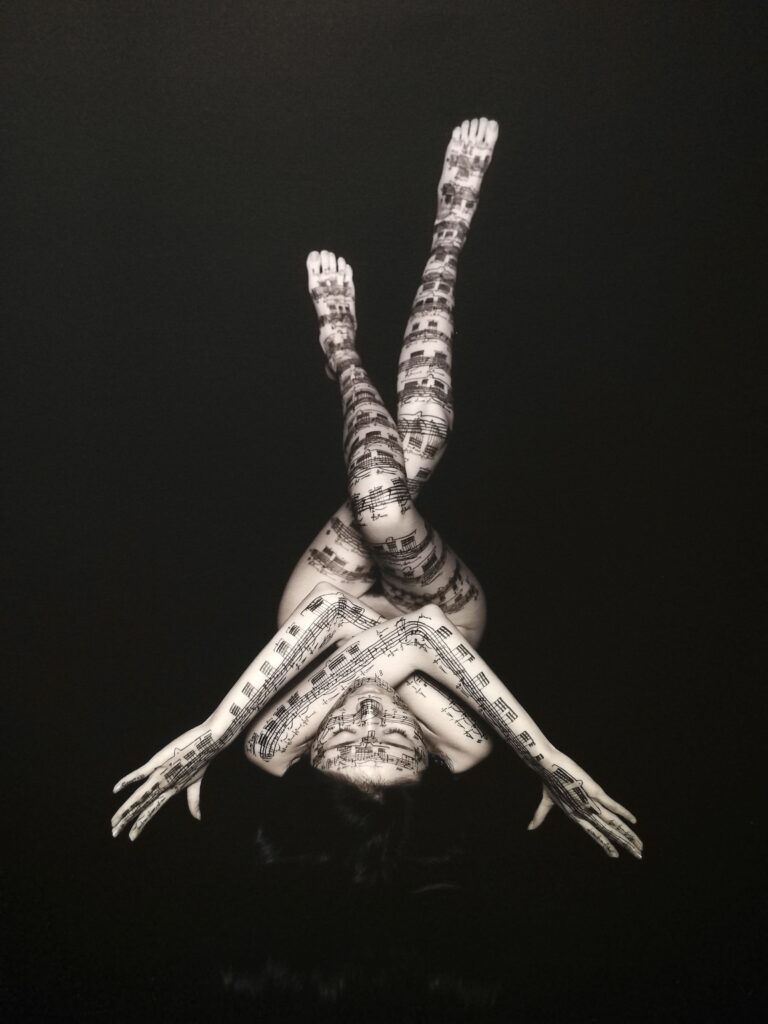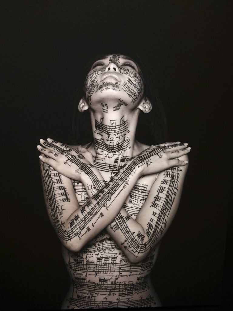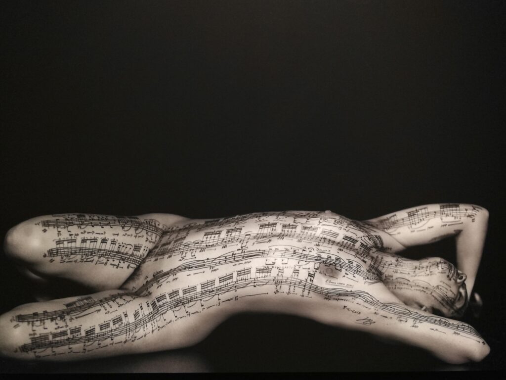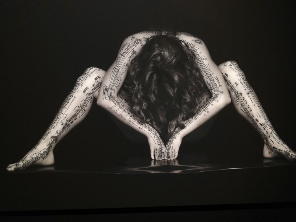 様々にポージングした人体に直接楽譜を描き、撮影した写真作品の数々。これらの中には、鑑賞者が前に立つと そこに描かれている楽譜の曲が流れる作品もあり、その(現代音楽のような)音色は静かでやや照明が落とされた空間に調和し、会場そのものが一つの作品といえるような雰囲気をつくり出していました。