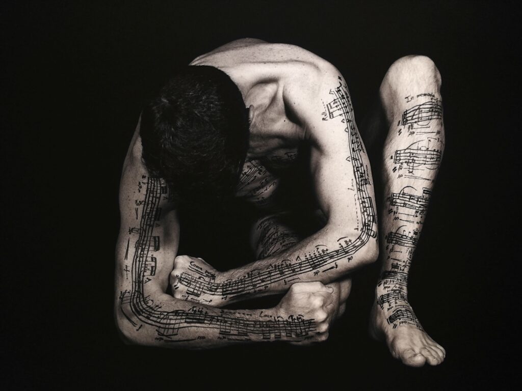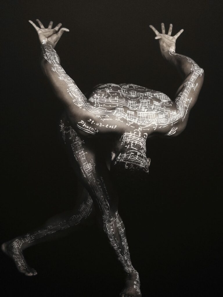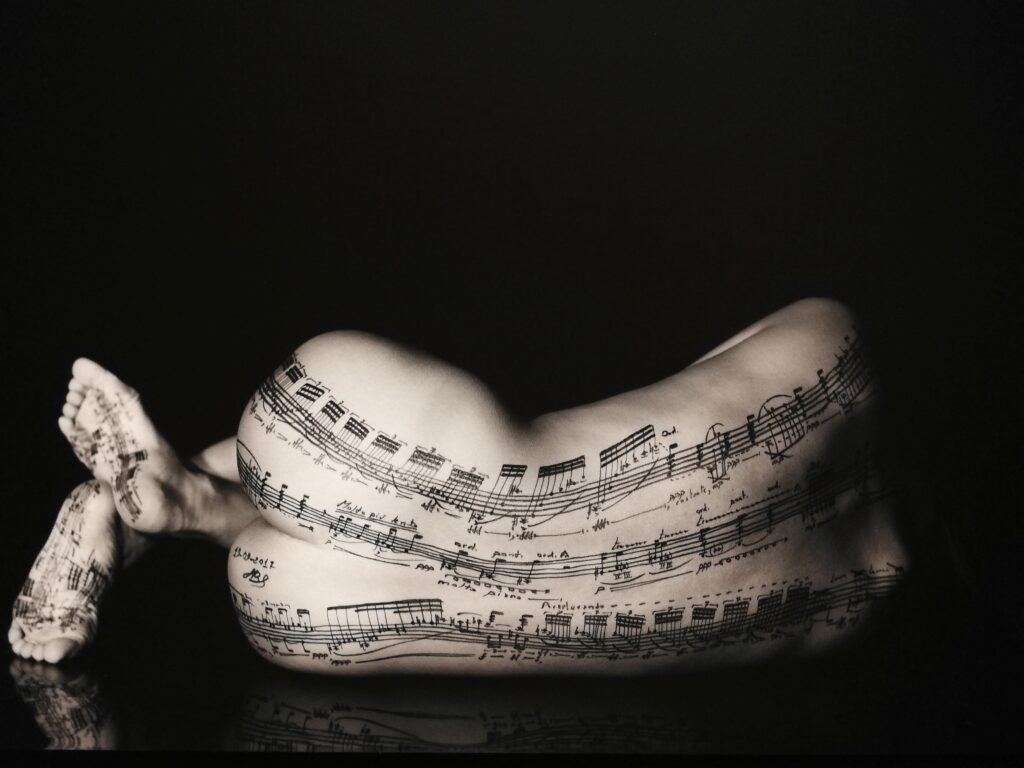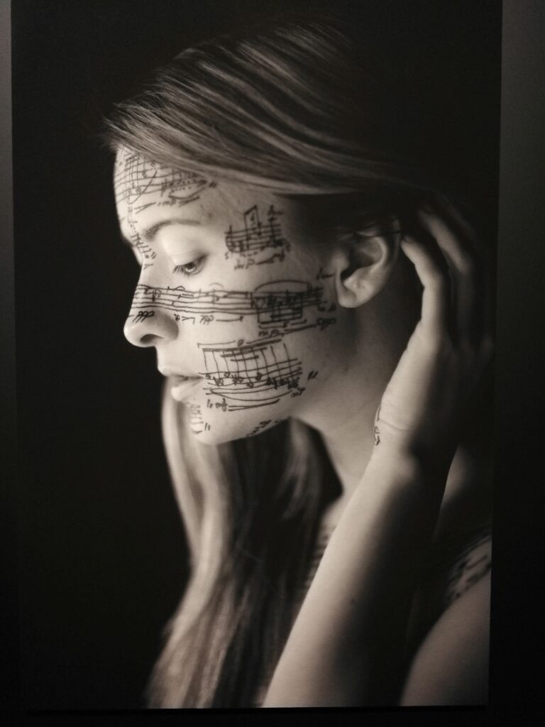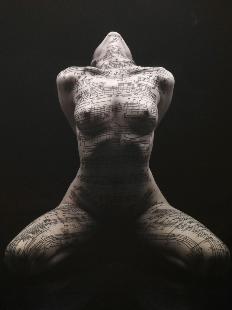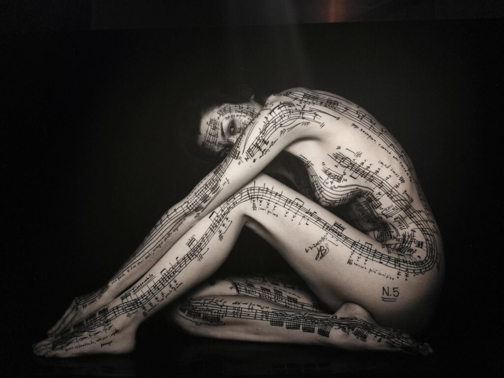 様々にポージングした人体に直接楽譜を描き、撮影した写真作品の数々。これらの中には、鑑賞者が前に立つと そこに描かれている楽譜の曲が流れる作品もあり、その(現代音楽のような)音色は静かでやや照明が落とされた空間に調和し、会場そのものが一つの作品といえるような雰囲気をつくり出していました。