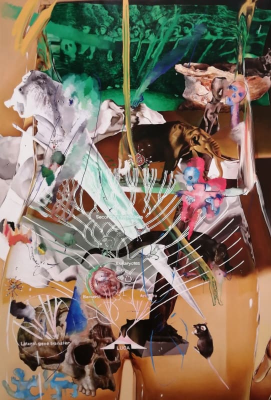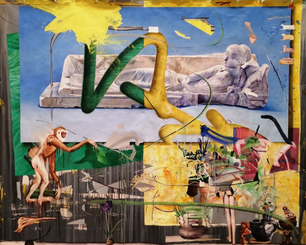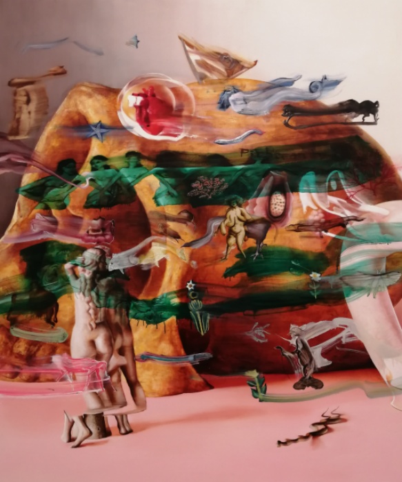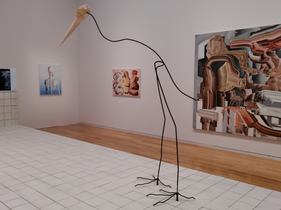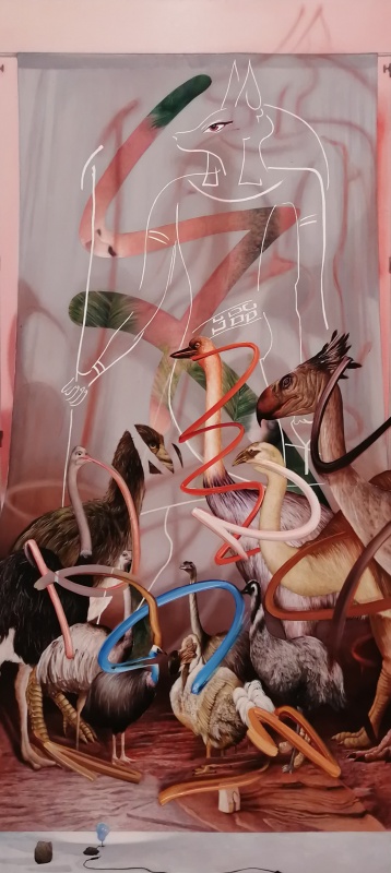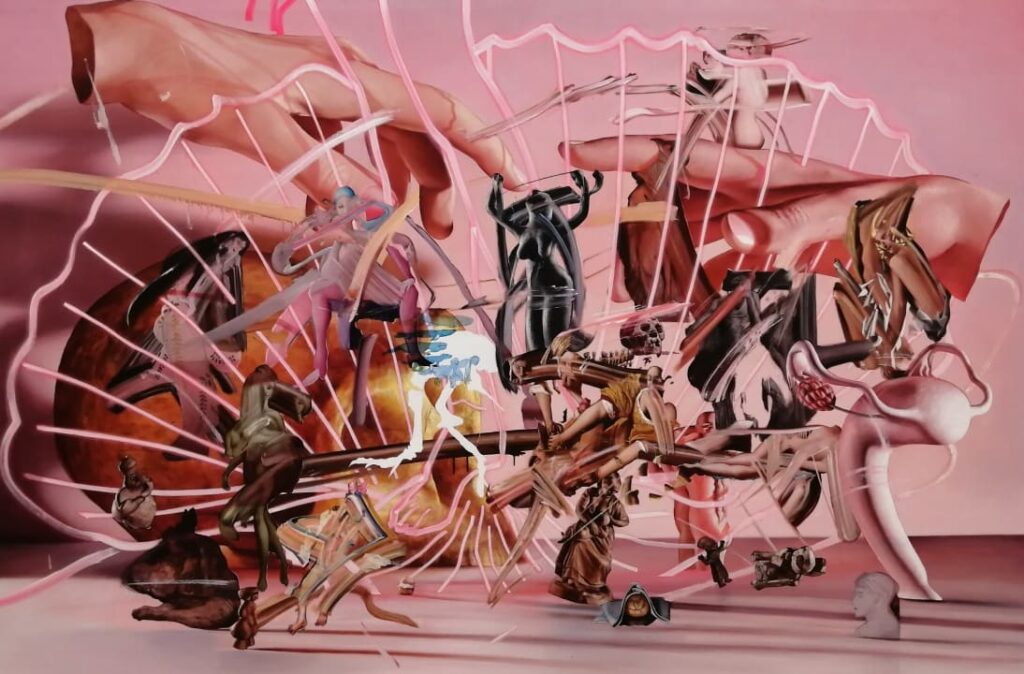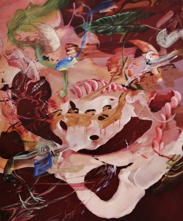 彼女の平面作品は、ネットなど様々なメディアから集めた画像をコンピューターで加工処理した下図をもとに油彩で描く手法を用いています。一見、写真などの画像をコラージュして制作しているように見えますが、近くで見ると油彩で手描きしているのが分かります。