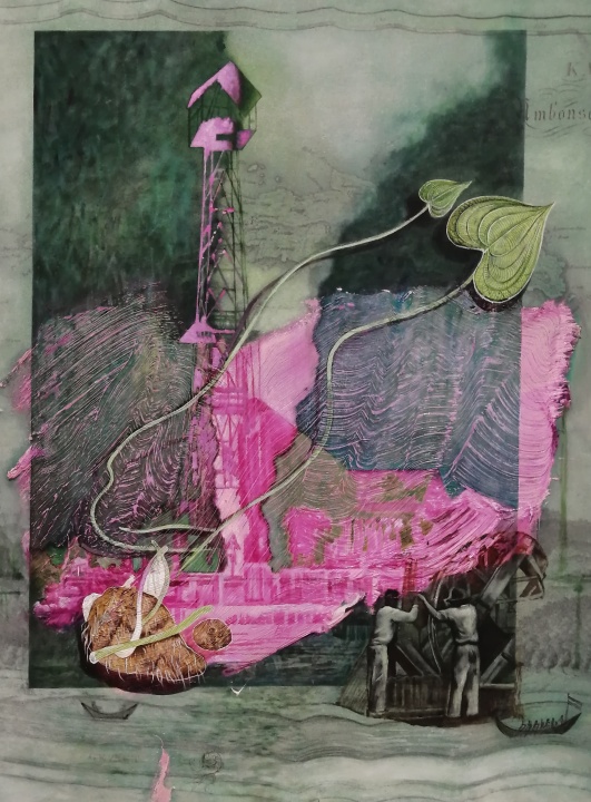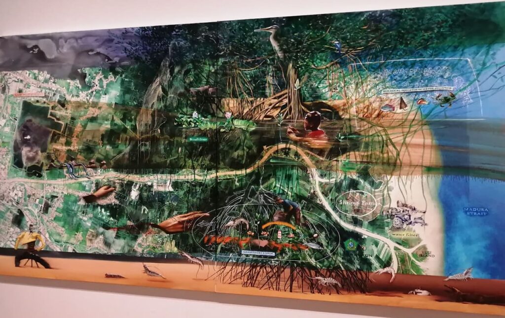 モチーフはインドネシアでの体験をもとに、環境問題をはじめ野生の動植物、民話や歴史、現代における社会問題に至るまで混沌とした要素を一つの巨大画面に定着させているように思います。本展のサブタイトル ‘タナ・アイル’ はインドネシア語で ‘土・水’ を示し、2つを合わせると ‘故郷’ を意味するそうです。