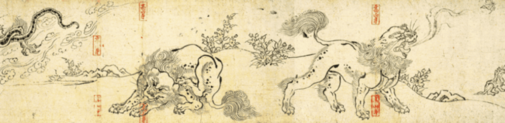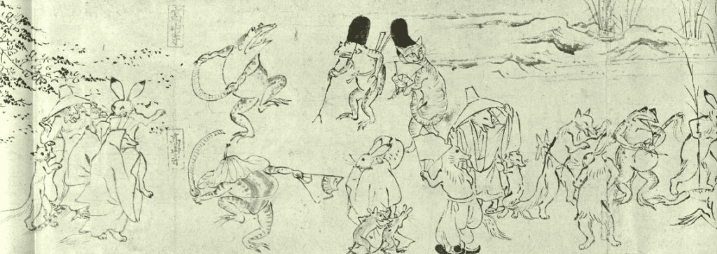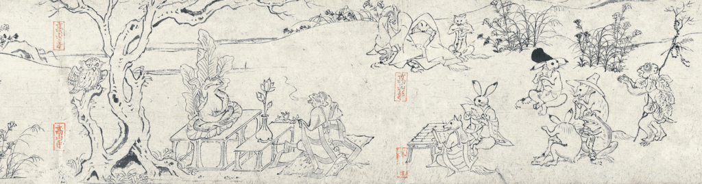 平安時代から鎌倉時代に描かれたとされる絵巻は甲・乙・丙・丁の全4巻からなります。中でも平安時代後期の甲巻は ‘兎、蛙、猿、狐’ などの動物が擬人化され描かれており、特に興味をひきます。