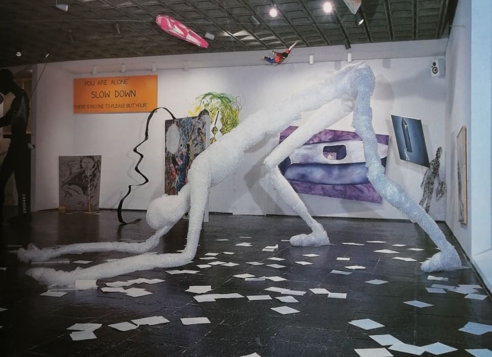 広大な空間を自在に使い、夢の中や子供の頃の記憶などポップアート的な絵画を描いたり、ハンマーを持った巨人のオブジェを生み出すなど変貌していきます。