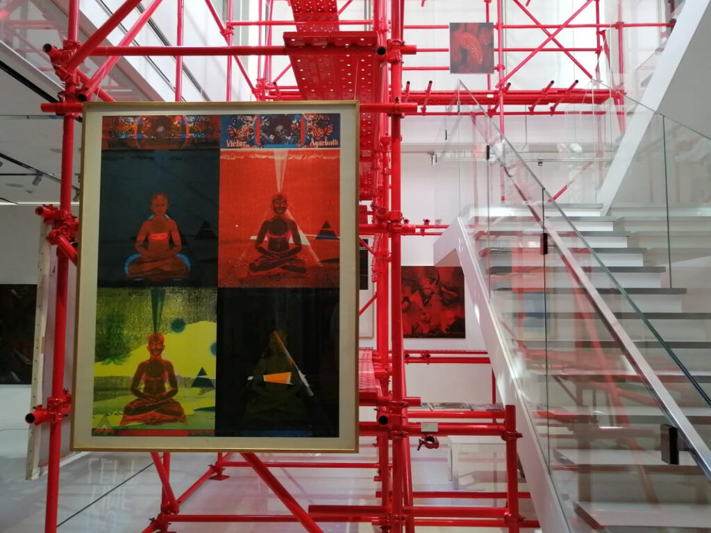 本展は1970年の大阪万博・せんい館を横尾氏が建築デザインした際の ‘未完の足場’ を再現し、2025年に制作された最新作を中心に過去作とともに紹介するユニークな試みです。