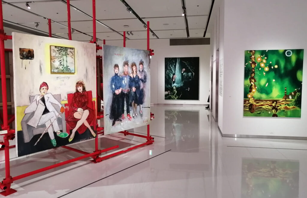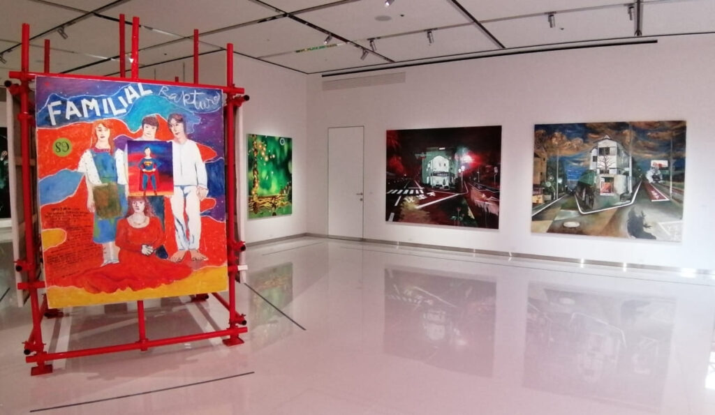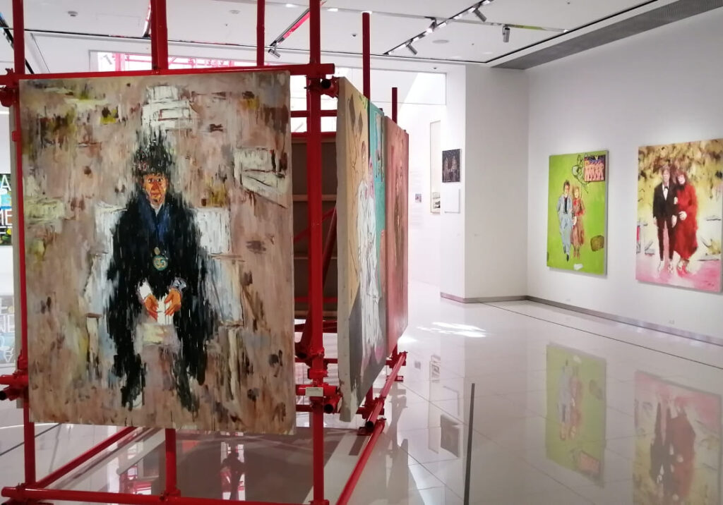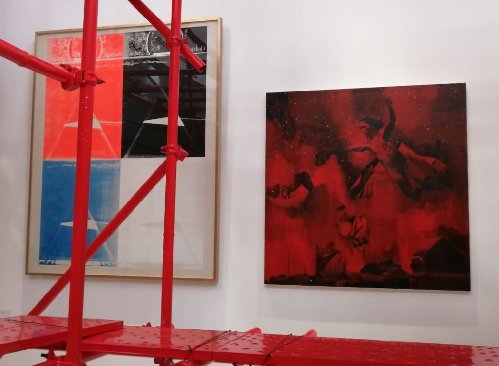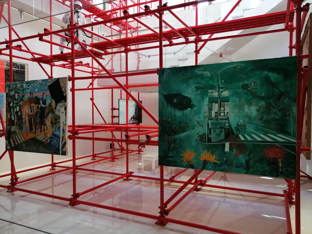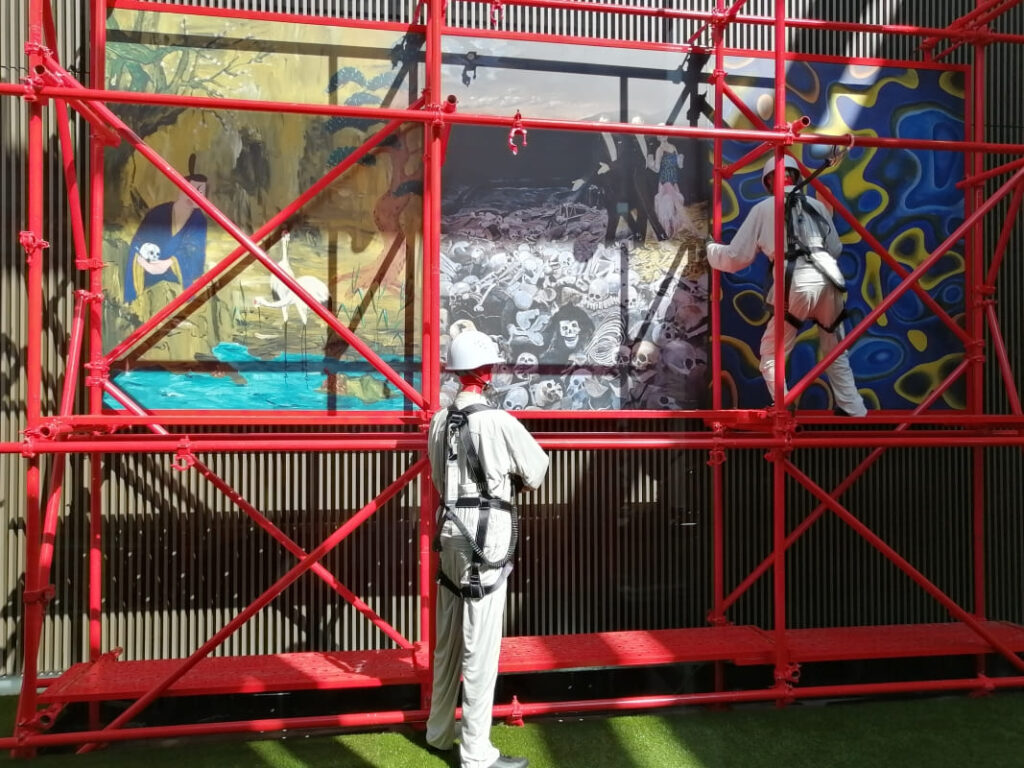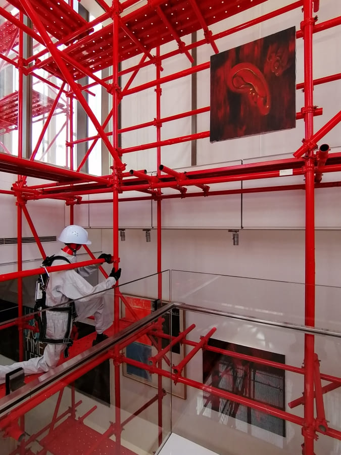 建物の最上階と一部屋上を用いた会場では、真っ赤に塗装された足場と油彩画が一体となり立体的な構成で展示されていました。足場を組んでいる作業者(レプリカ)も展示に加わっています。