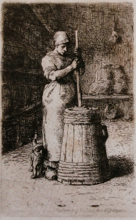 バターをかき回す若い女(エッチング),1855-56 山梨県立美術館蔵