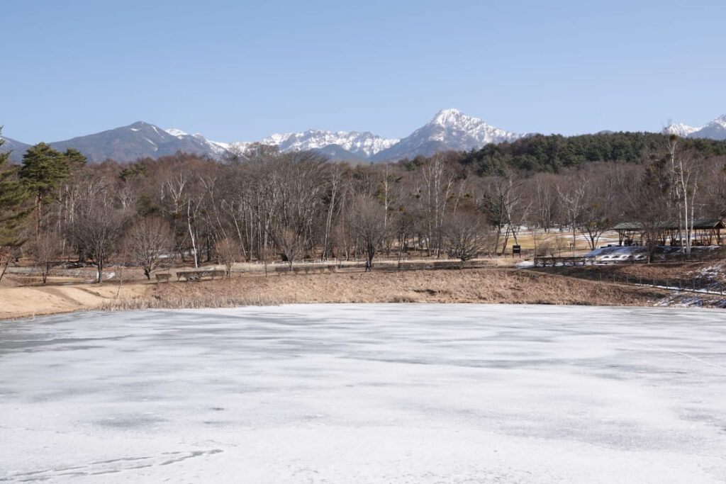 原村の自然文化園内にある ‘まるやち湖’ は夏場にトンボを求めて毎年訪れますが、冬季は今シーズンが初めてです。標高1,300mにある当地の湖(池)は全面凍っていました。