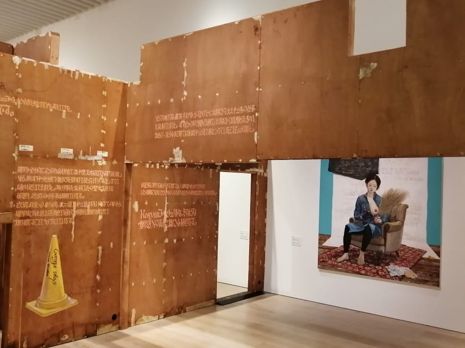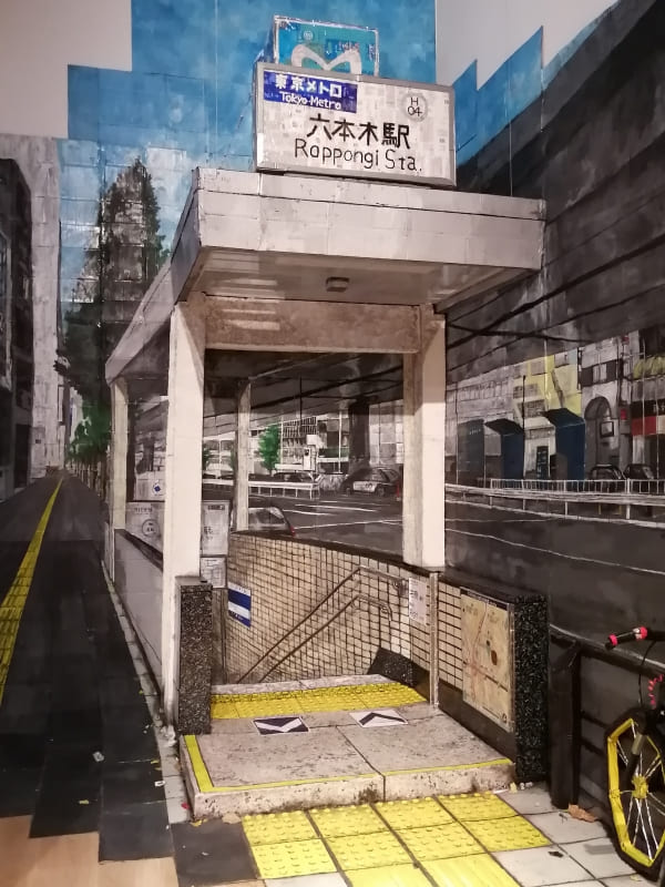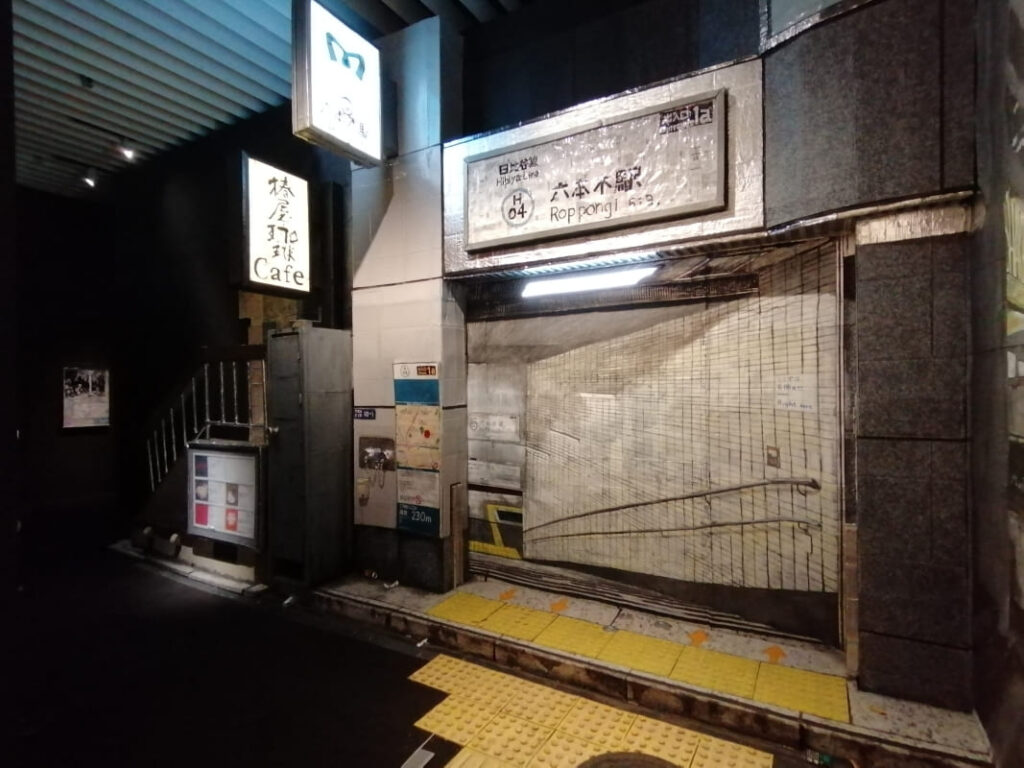 本展で最も興味深く(面白く)好感が持てた作品は、六本木駅を模した ‘ズガ・コーサクとクリ・エイト’ による段ボールと絵の具で作られた工作のような(舞台背景のような)立体作品 ‘地下鉄出口(2025)’ です。その描写は細部まで非常にリアルでありながら、クスッと笑えるようなユーモアに満ちており、地下鉄 ‘六本木駅’ の匂いまで表現しているようです。
