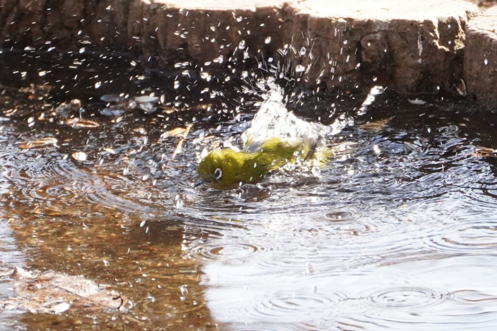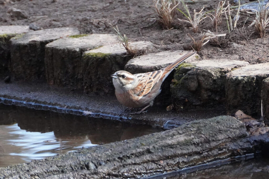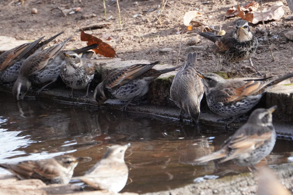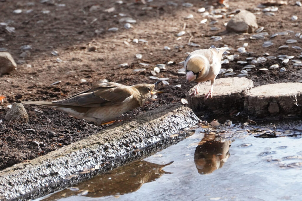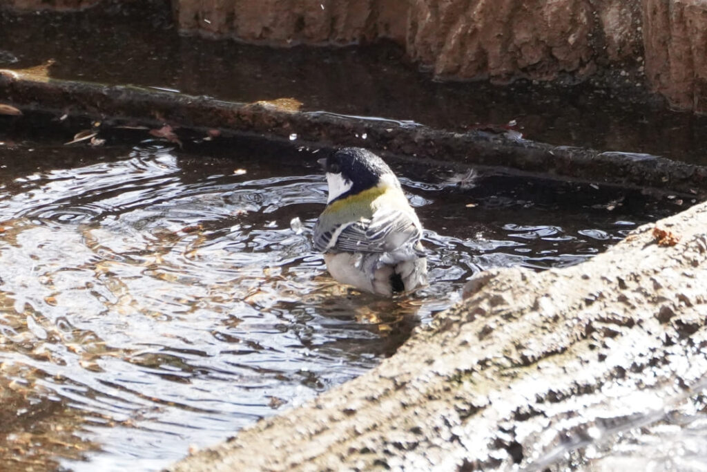 武田健康の森には野鳥観察小屋があり、人工的な水辺が設けられています。前述のとおりこの冬はどこも水不足のためか、たくさんの鳥たちが水辺を求めて現れ、水を飲んだり、水浴びしたりと賑わっていました。ヤマガラ、シジュウカラ、メジロ、ホオジロ、ルリビタキ、シロハラ、シメ、ツグミ、ヒヨドリなど。