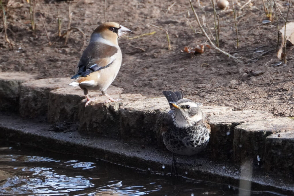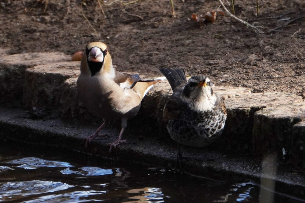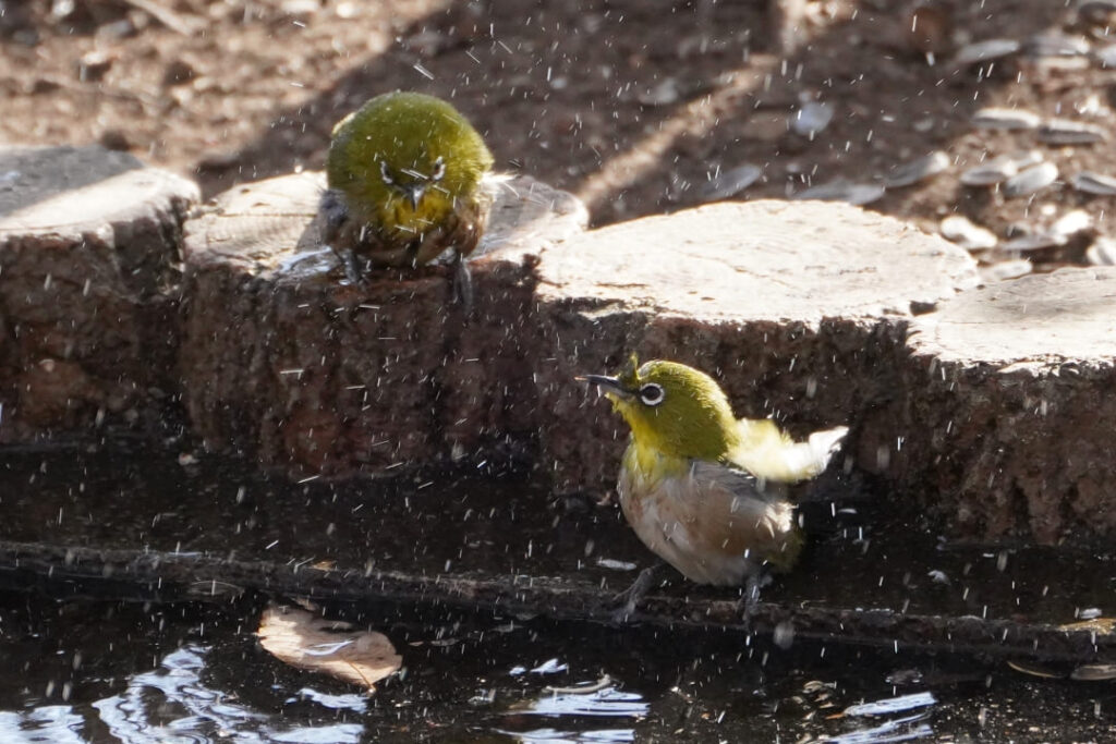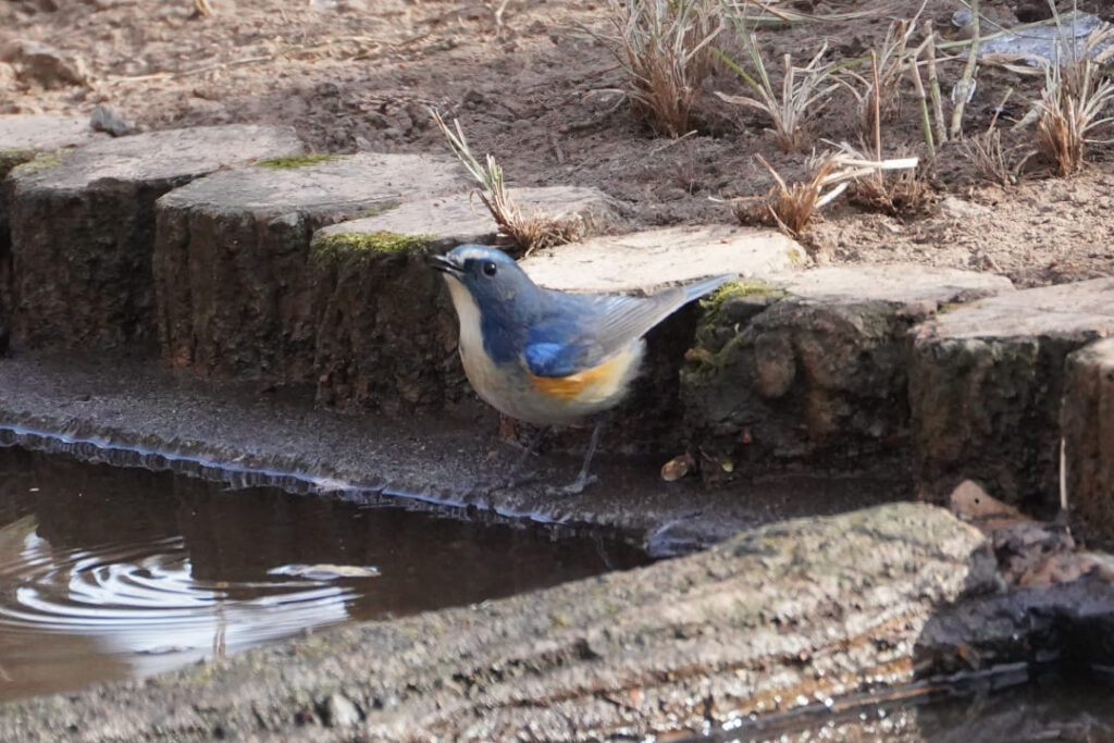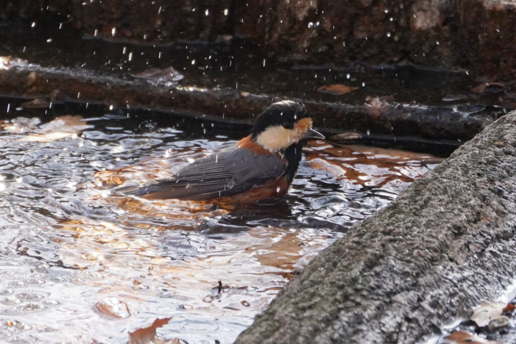 武田健康の森には野鳥観察小屋があり、人工的な水辺が設けられています。前述のとおりこの冬はどこも水不足のためか、たくさんの鳥たちが水辺を求めて現れ、水を飲んだり、水浴びしたりと賑わっていました。ヤマガラ、シジュウカラ、メジロ、ホオジロ、ルリビタキ、シロハラ、シメ、ツグミ、ヒヨドリなど。